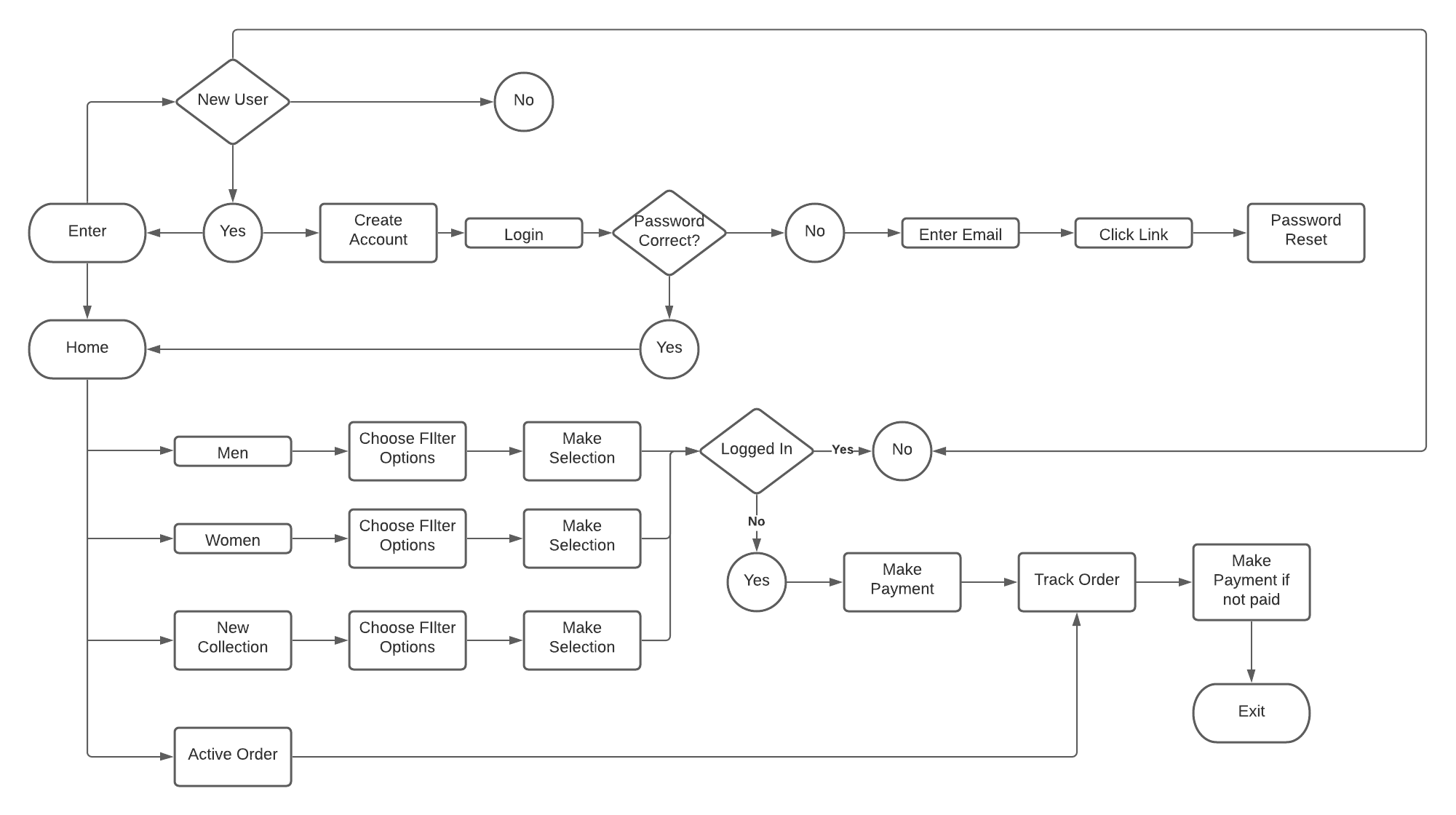 We created a flow using Lucid to illustrate how the user will navigate through the website.